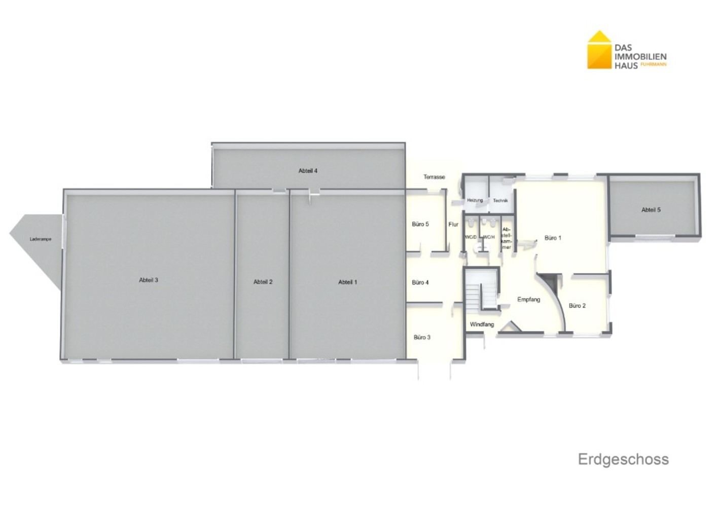 Treppenhaus, Empfang, Abstellkammer, Damen und Herren Toilette, 5 Büroräume, Teeküche, Hausanschlussraum, Heizung, Terrasse
