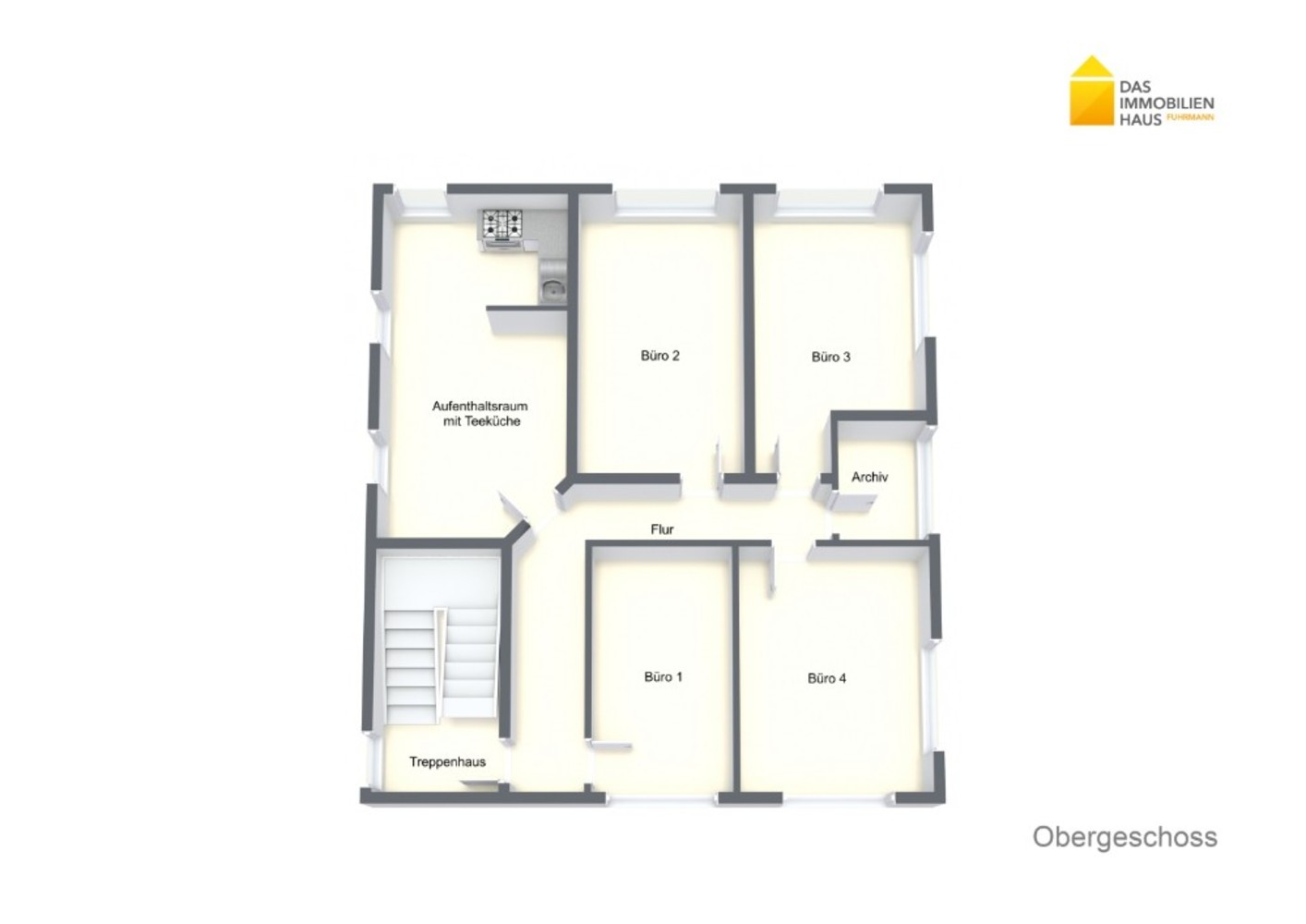Flur, 4 Büroräume, Aufenthaltsraum mit Teeküche, Archiv