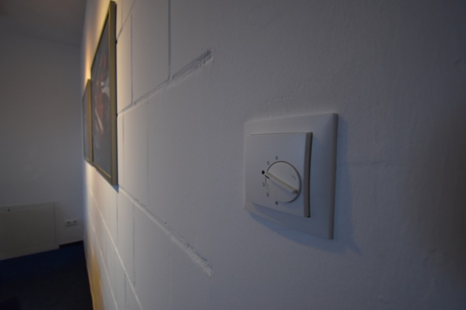 glatt gespachtelte Wände, weiß gestrichen, teilweise sichtbarer Kalksandstein, weiß gestrichen, teilweise mit Wandpaneele und Glasabtrennung